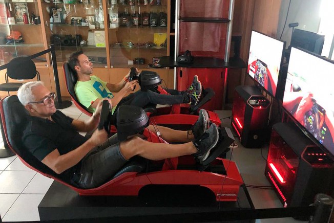 Visita de luxe al Circuit d’Osona. Kini Muntadas, Jordi Gaig i Gerard Farrés, un dels grans pilots de motos dels últims anys del Dakar, van gaudir d’una sessió apassionant del nou simulador de conducció virtual.