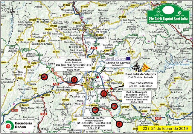Aquest divendres, 8 de febrer, s’han fet públics l’itinerari i els horaris de la 22a edició del Ral·li Esprint Sant Julià, que es disputarà el 24 d’aquest mateix mes. L’organització ha tornat a apostar pel traçat que es va estrenar l’any passat, amb els trams de la Collada del Vilar, entre Taradell i Viladrau i Casamiquela, a l’antiga carretera d’Olost.