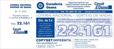 L’Escuderia Osona ha posat a la venda el número de la loteria de Nadal. Enguany és el 22.161 i el venem en butlletes de 5 euros, perquè el premi quedi ben repartit. Si vols, pots reservar-lo enviant un mail a la Neus: info@escuderiaosona.com. També te les podem fer arribar a casa, previ pagament de les despeses enviament.