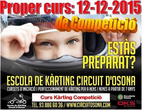 L'Escuderia Osona organitza el dissabte 12 de desembre un curs de kàrting d’iniciació i perfeccionament amb karts de competició, que es farà al Circuit d’Osona. La iniciativa està adreçada a nens i nenes a partir de 7 anys.